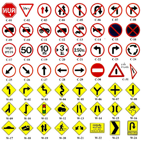 Road signs can ba a warning for driver safety ( yellow signs ) , orders to be followed ( red signs ) , or additional information ( green signs )A sign with a cross through it signifies something cannot be done,